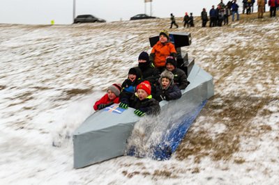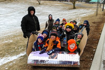 On February 14th 2016, the Mighty Tippecanoe Tribe hosted the annual Winnipeg / Great Elk Nation cardboard sled race at Melas Park in Mount Prospect. The rules of the event are simple: each tribe is to construct a sled consisting of nothing but cardboard, duct tape and glue. Judging is done in two categories; 1st for design voted by each Tribal Chief and 2nd for distance (farthest from the starting point). Unfortunately, the snow cover was at a minimal at the hill the morning of the race, but that did not stop the Nation from moving forward with the event.
